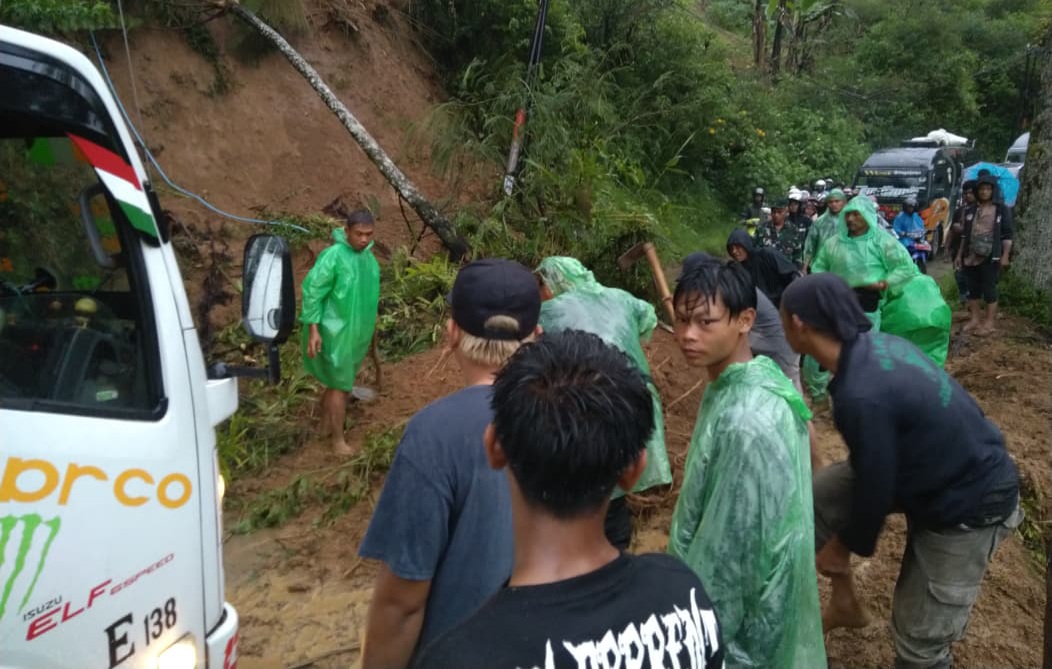 Akibat kejadian tersebut, akses lalu lintas baik kendaraan roda dua (R2) maupun roda empat (R4) sempat tidak bisa melintas karena tertutup material tanah dan batu.